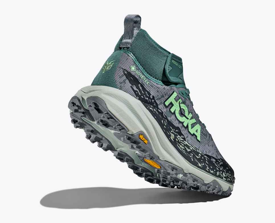 The Speedgoat 6 Mid GTX is built with the same trust-inspiring waterproof GORE-TEX membrane as before but now with a more flexible, running-friendly collar. Grounded in Vibram Megagrip with Traction Lug for enhanced bite on loose soil, this trail icon employs a foot-cradling heel bolster, lightweight, responsive midsole compound, and a protective toe rand for charging through the rough stuff. Bring it, weather.